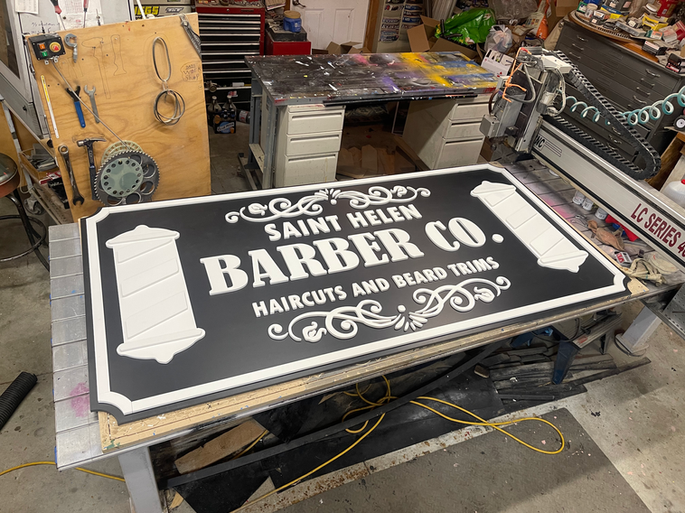 Designed for Saint Helen Barber Co., this custom PVC sign was built to be both durable and eye-catching. Layered construction and raised accents add depth while keeping the sign easy to read from the road. The traditional design elements pay homage to classic barbershop style.